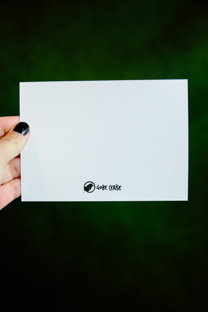 Carte A6 (format carte postale « classique ») à Accrocher ou à Offrir. Au dos des cartes : fond blanc + tampon du Gobe Cerise en noir. Papier épais, finition Soft Touch sur le côté illustré (texture particulièrement agréable au toucher !).