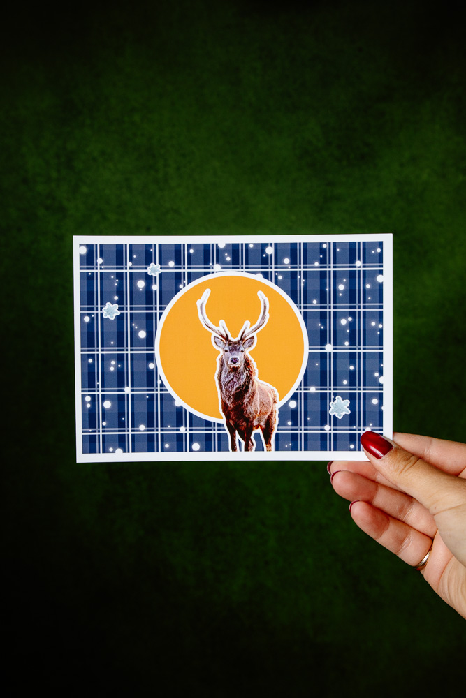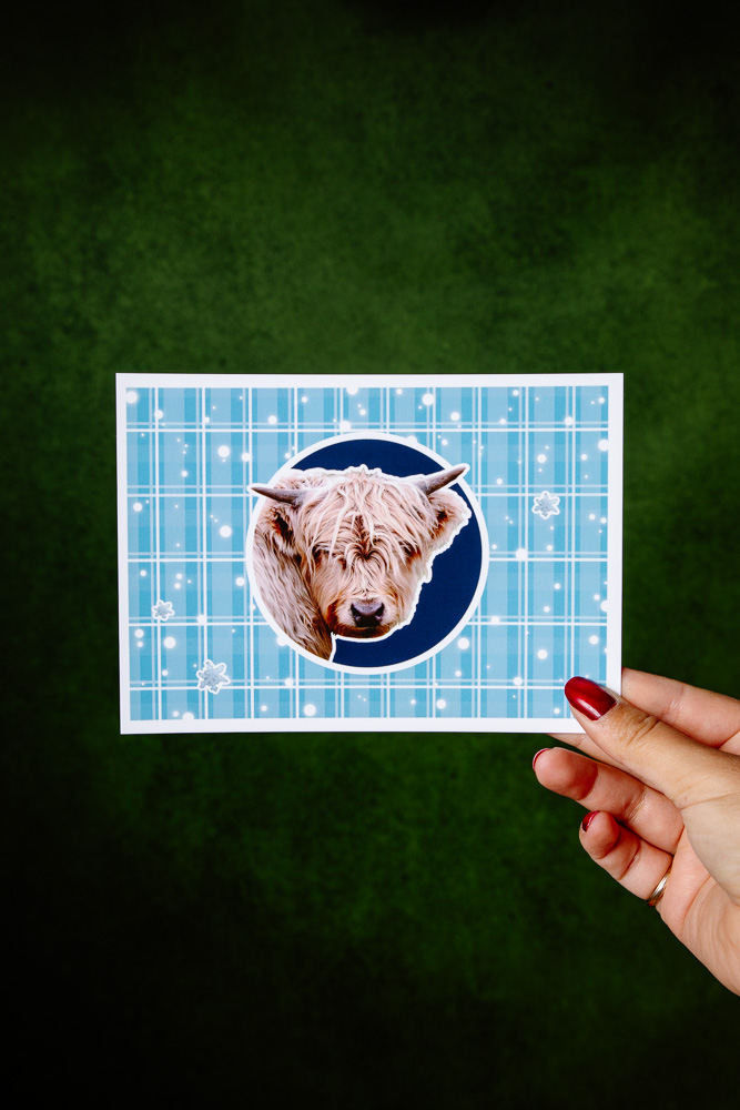 Grandes Cartes sur le thème des Animaux d’Écosse, Hivernales / Bleues, avec ou sans enveloppes Kraft. Taille : 127mm x 177.8mm (plus grandes que des cartes classiques A6). Papier finition Soft Touch au Verso (texture particulièrement agréable au toucher !). Tampon du Gobe Cerise noir au dos des cartes.