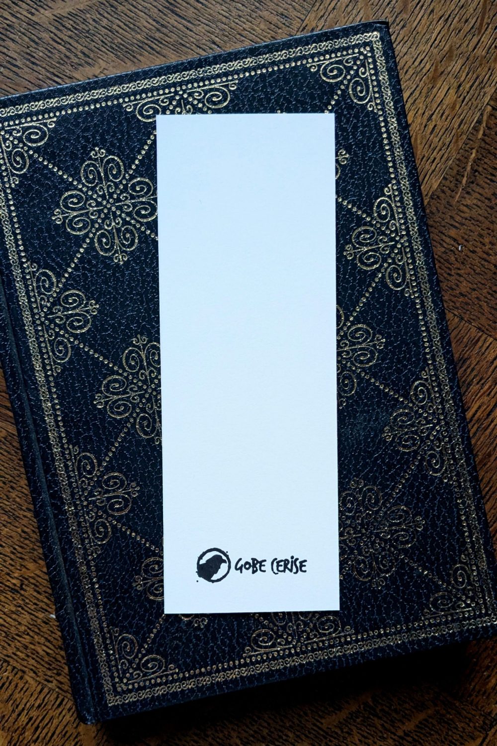 Marque-Page Finition « Soft Touch » agréable en main côté recto, tampon noir du Gobe Cerise au dos. Taille approximative : 5,2cm * 14,8 cm (format poche).