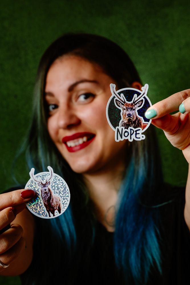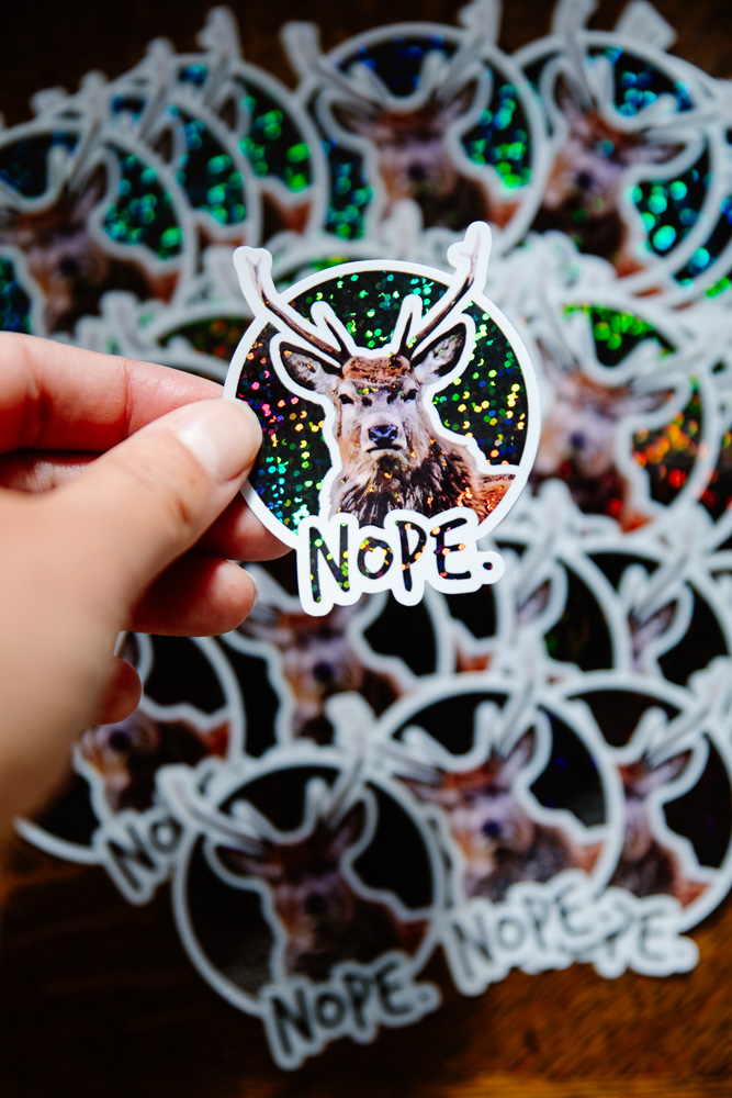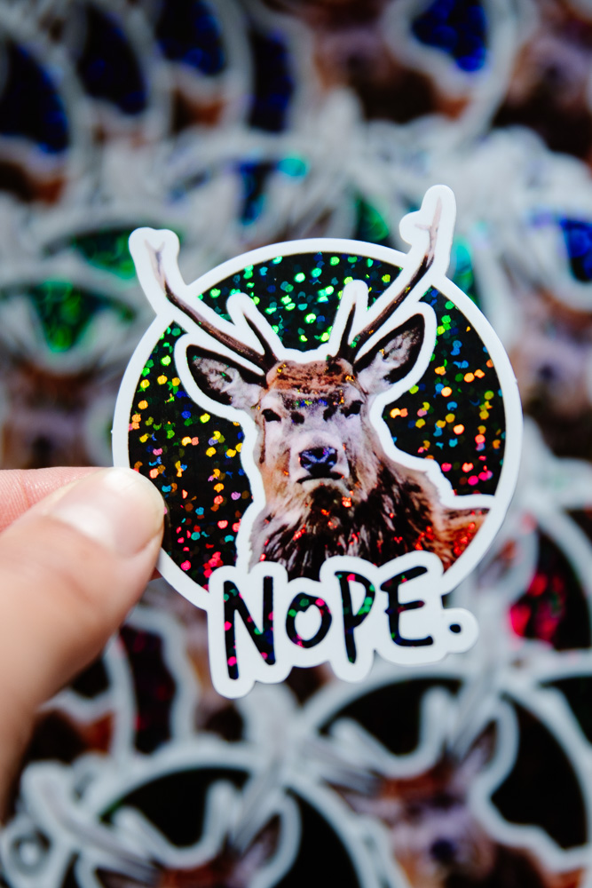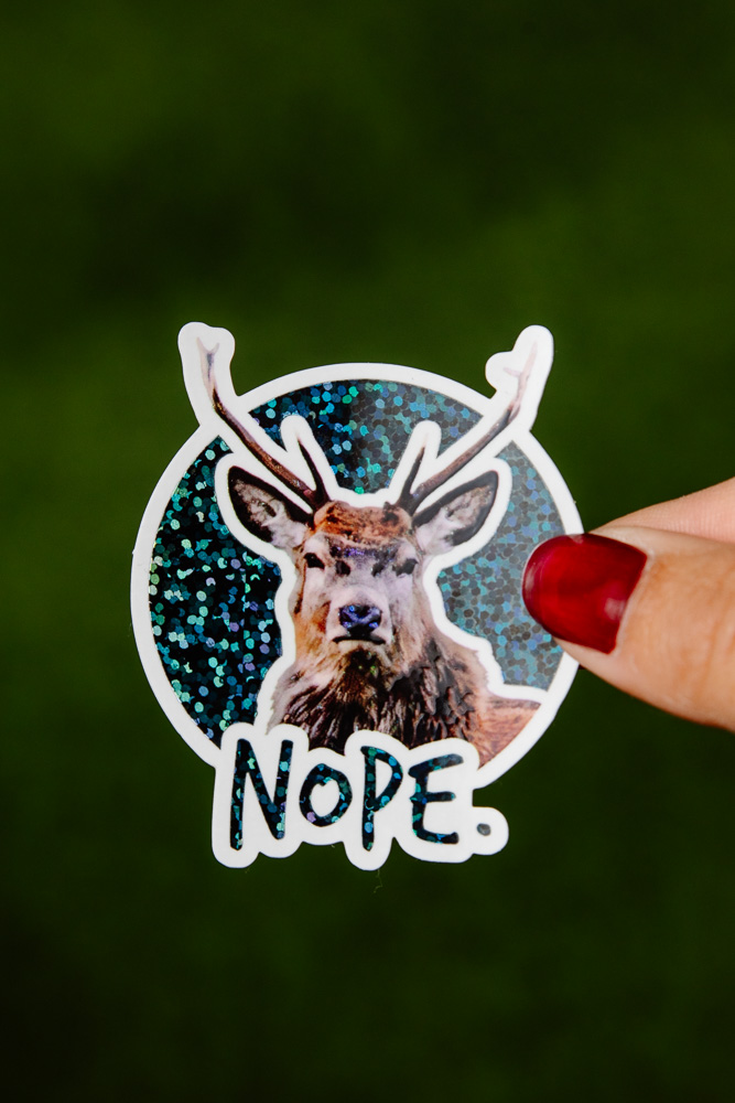Sticker cerf Grumpy « NOPE », Fond NOIR et/ou multicolore selon la lumière, Pailleté / Brillant, taille approximative 5.5×6.5 cm. Matériaux durables, résistants aux rayures, à l’eau et protégés contre les UV (sauf si finition mate).
