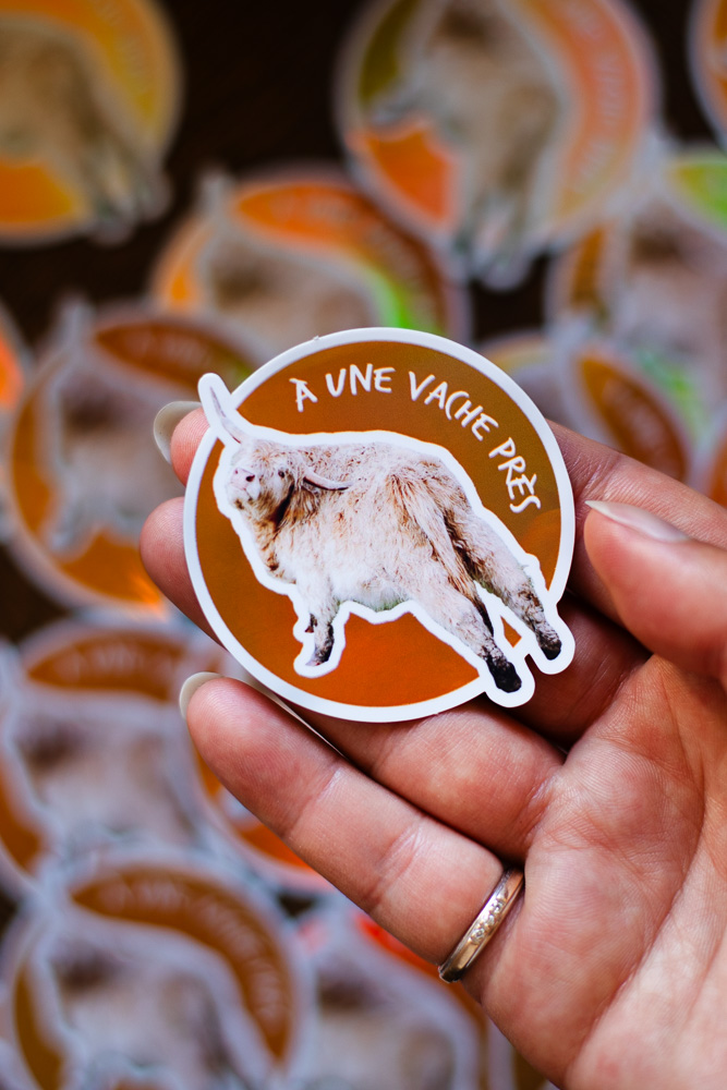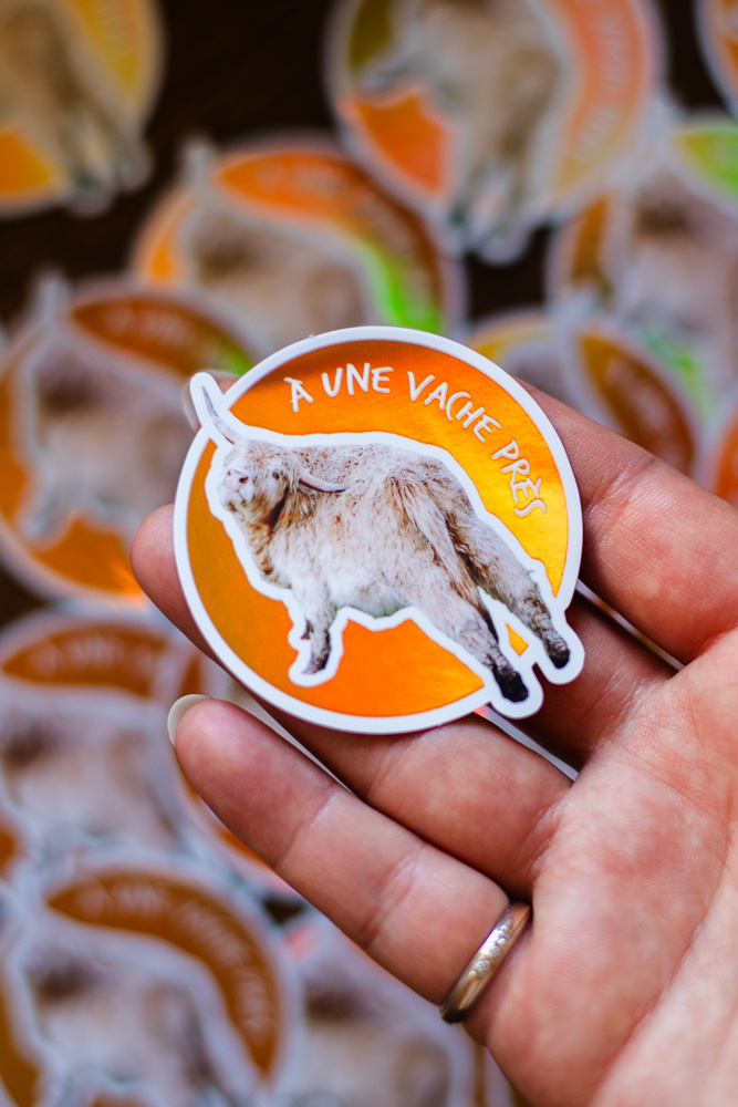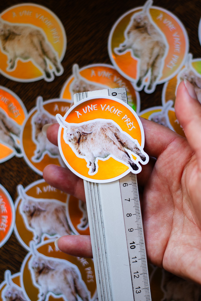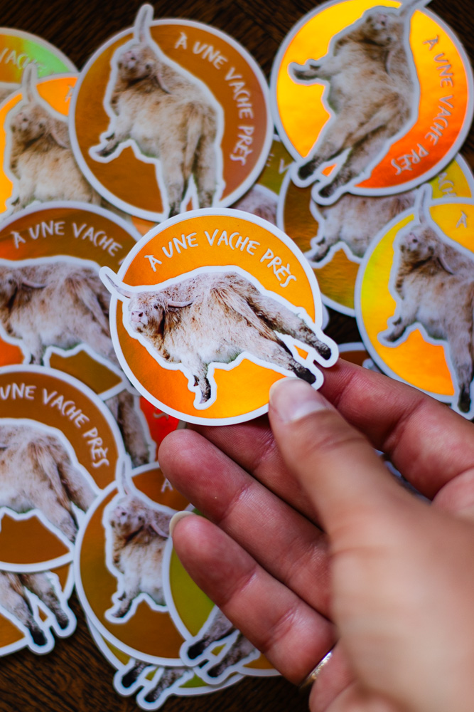 Sticker vache des Highlands beige, texte « À une vache près », Fond Orange Holographique / Brillant, taille approximative 5.7×6 cm. Matériaux durables, résistants aux rayures, à l’eau et protégés contre les UV (sauf si finition mate).