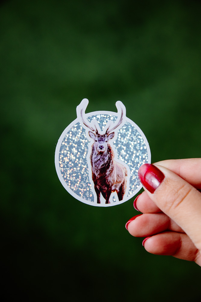 Sticker cerf sous la neige, Fond blanc – multicolore selon lumière, Pailleté / Brillant, taille approximative 5.5×6.2 cm. Matériaux durables, résistants aux rayures, à l’eau et protégés contre les UV (sauf si finition mate).