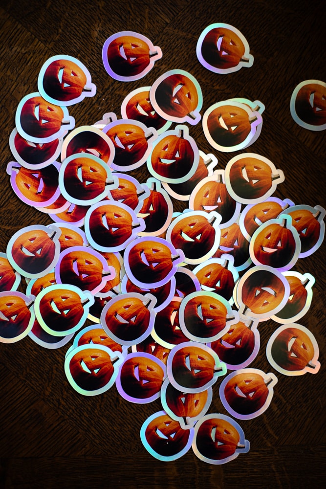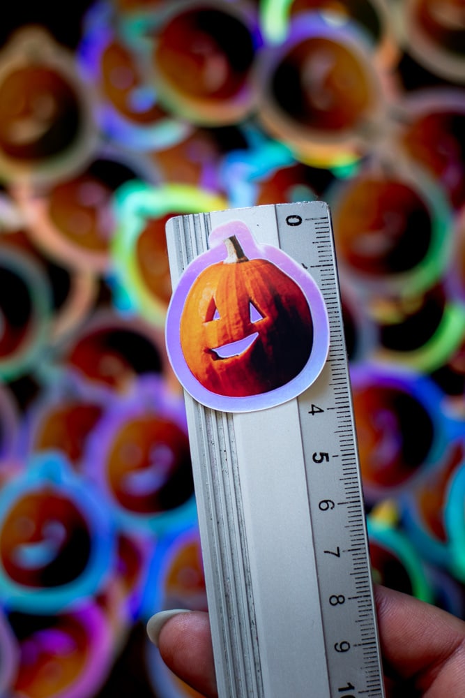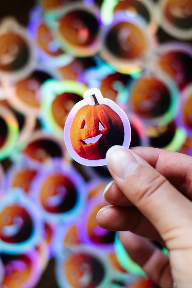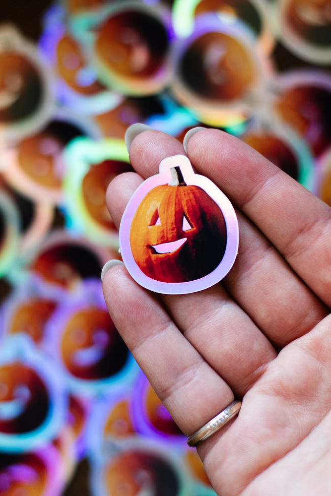 Sticker Mini-Citrouille d’Halloween, Holographique / Brillant, taille approximative 3.5×4 cm. Matériaux durables, résistants aux rayures, à l’eau et protégés contre les UV (sauf si finition mate).