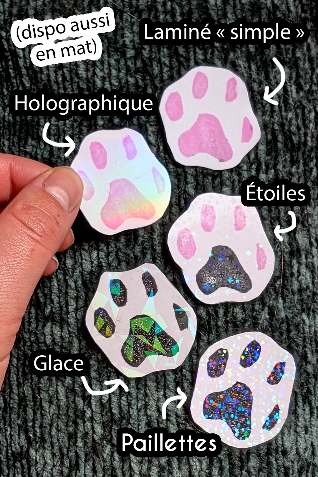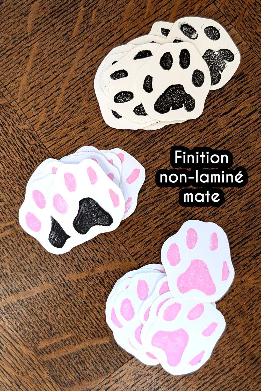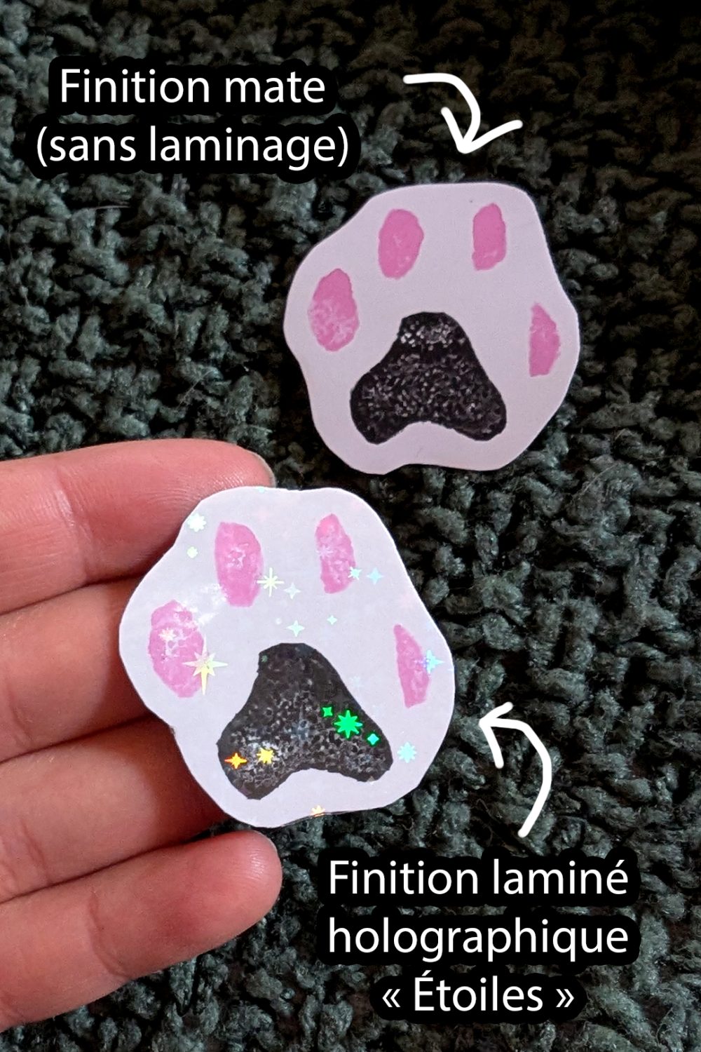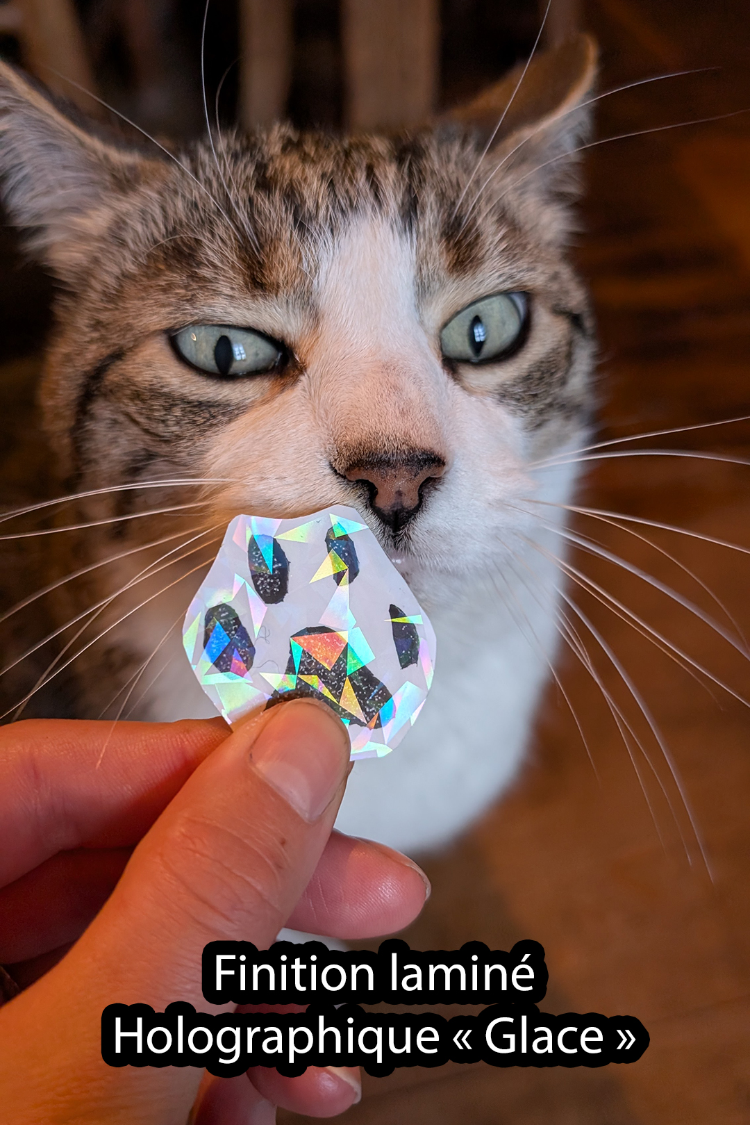 Choix de la finition : Attention, sans laminage (finition mate – par défaut), ces stickers sont sensibles à l’eau et aux UV. Ils sont donc à utiliser de préférence en intérieur, ou dans des carnets, etc. Pour un usage plus intensif ou en extérieur (ou pour un esthétisme différent), sélectionner l’option « laminée ». Le laminage (holographique ou non), protège d’avantage vos stickers, mais donne un rendu visuel différent (moins « brut »). À choisir selon vos goûts et vos besoins ! 🙂