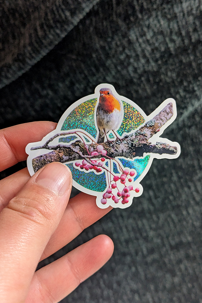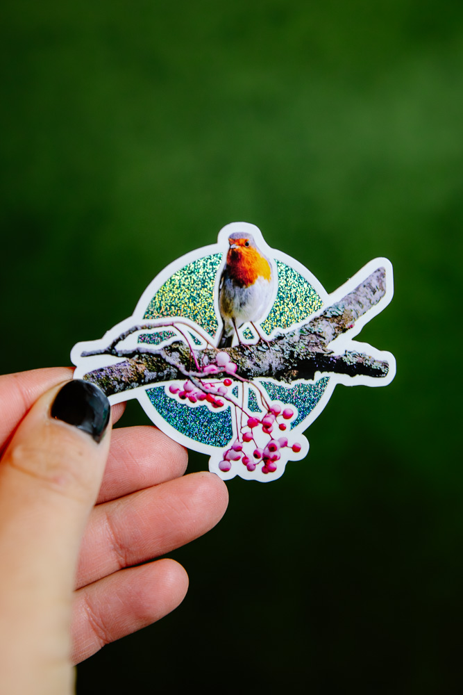 Sticker Rouge-Gorge d’Écosse – Fond bleu-vert multicolore selon lumière, Pailleté (paillettes fines) / Brillant, taille approximative 7×5.7cm. Matériaux durables, résistants aux rayures, à l’eau et protégés contre les UV (sauf si finition mate).