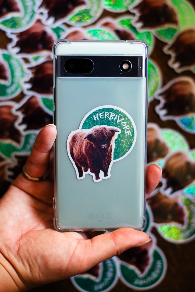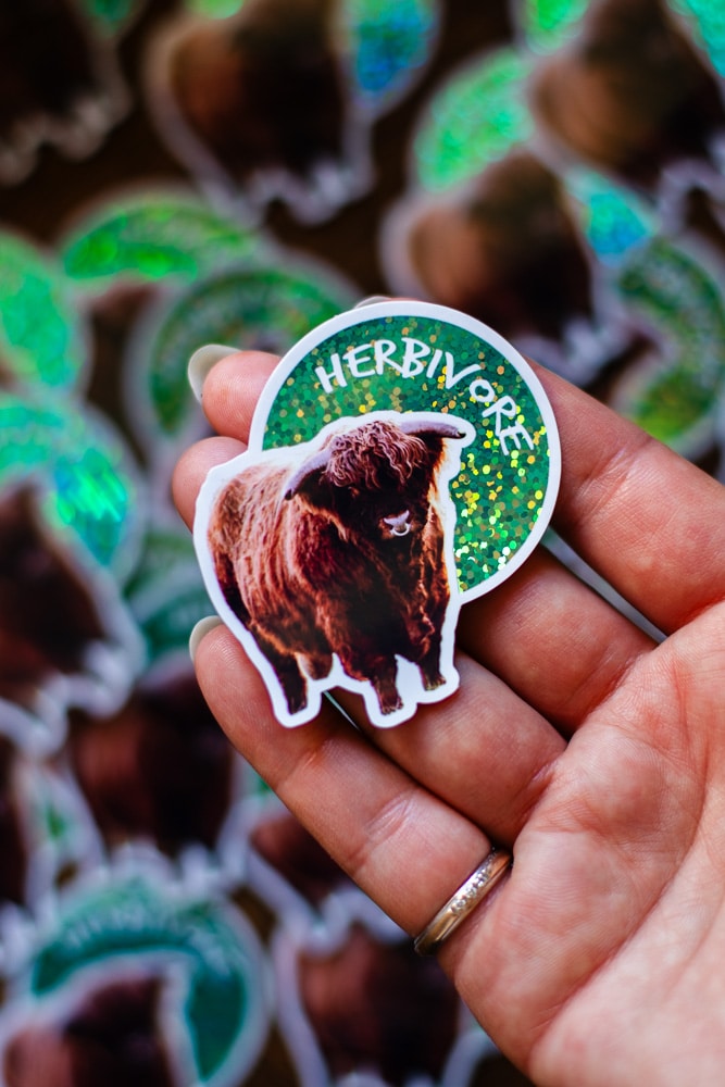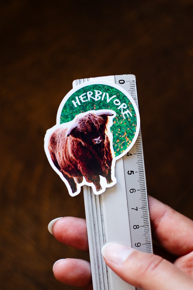 Sticker Taureau des Highlands « Herbivore » (Team Veggies ! 😉 <3), Fond vert Pailleté Brillant, taille approximative 5.7×6 cm. Matériaux durables, résistants aux rayures, à l’eau et protégés contre les UV (sauf si finition mate).