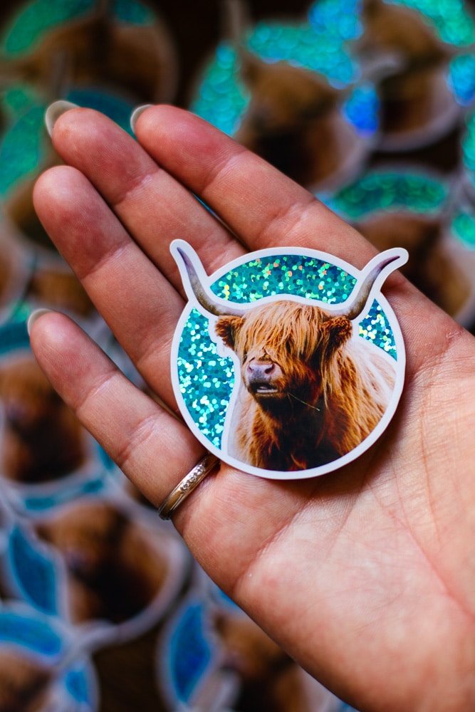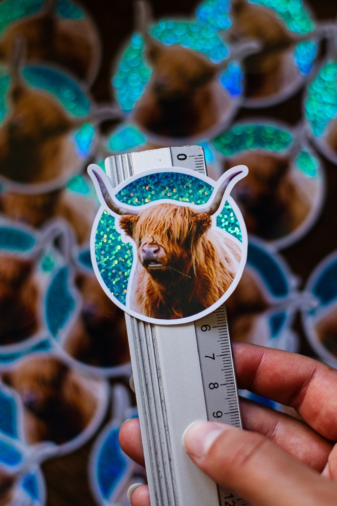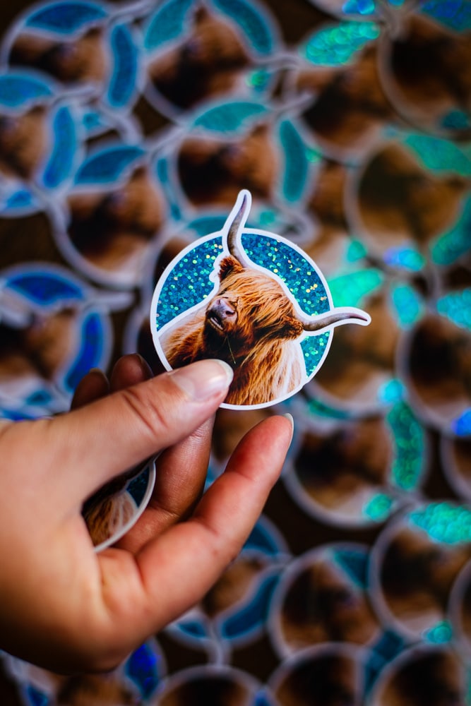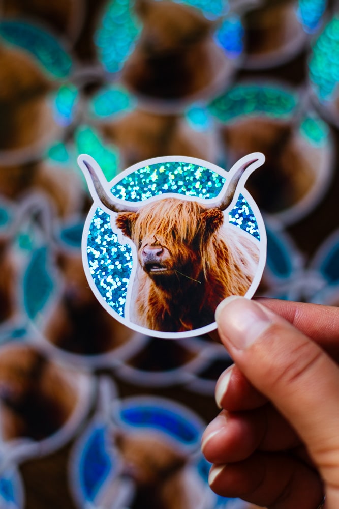 Sticker Vache des Highlands Rousse, Fond bleu Pailleté Brillant, taille approximative 5.7×5.7 cm. Matériaux durables, résistants aux rayures, à l’eau et protégés contre les UV (sauf si finition mate).